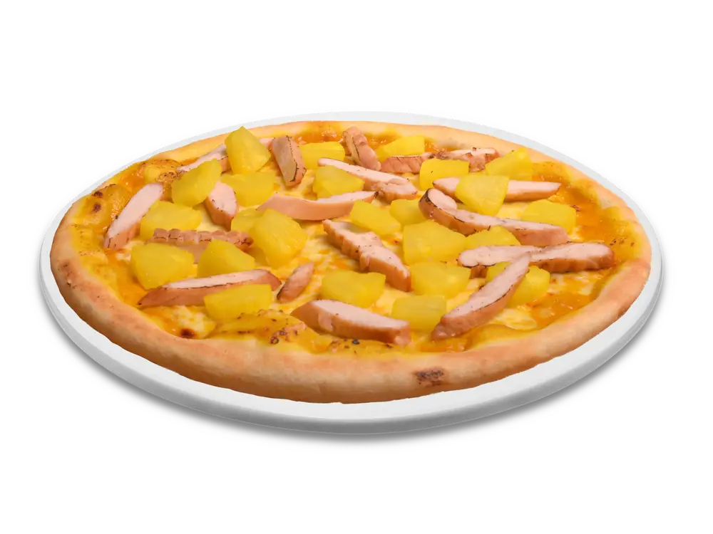 Frischer Teig, Tomatensauce, echter Käse, Ananas, Hühnerbruststreifen